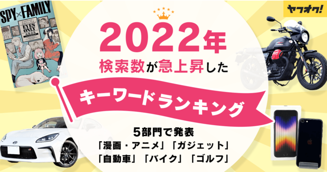 ヤフー株式会社(以下、Yahoo! JAPAN)が運営するオークションサービス「ヤフオク!」は、2022年に、前年と比較して検索数が急上昇したキーワードランキングを、「漫画・アニメ」「ガジェット」「自動車」「バイク」「ゴルフ」の5部門で発表しました。