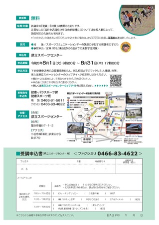 主な内容:ウォーキングサッカー、親子かけっこ教室、車いすバスケットボール、アルティメット、健康体操、ボルダリング、初めてのヨガ、脳トレリズム体操など