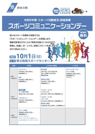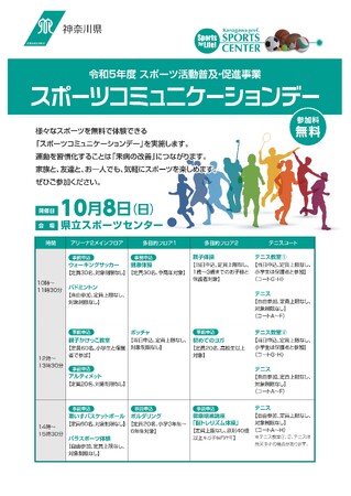 県では、スポーツを親しむ場と機会を県民の皆様に提供し、スポーツの習慣化を推進することにより、未病の改善を図るとともに、スポーツを通じて地域や家庭においてコミュニケーションを深める契機とするため、「スポーツコミュニケーションデー」を開催します。