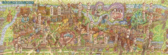 時代を超えて、板橋区の昔と今と絵本の舞台を見開きページいっぱいに収めたイラストマップです。