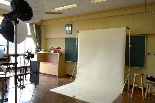 思い出深い校内にPICmiiのプロ仕様の機材と照明を設営。あえてカメラマンを介さず、自分たちだけでシャッターを切る環境を整えました。