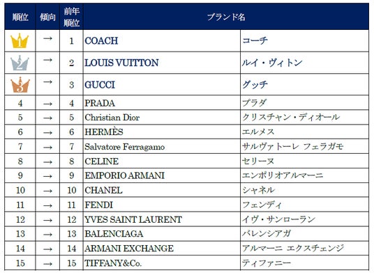 ラグジュアリーブランド販売数量ランキングは、1位「COACH」、2位「LOUIS VUITTON」、3位「GUCCI」となりました。昨年からランキングの変動はなく、上位2ブランドが数年にわたりトップの座をキープし続けています。