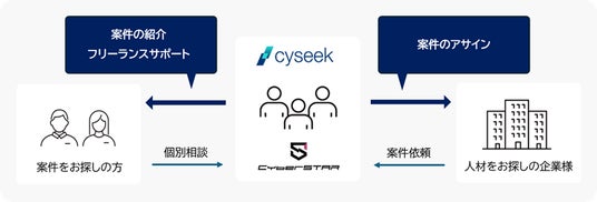 cyseekはサイバーセキュリティに特化した案件を取り扱い、フリーランスで活躍するエンジニアに紹介するプラットフォームです。セキュリティエンジニアを募集する企業が登録した案件と、登録されたフリーランスのセキュリティエンジニアを、CyberSTARのノウハウで目利きを行い、双方に最適な案件をアサインいたします。