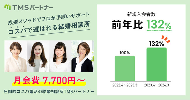 全国28拠点で結婚相談所サービスを提供する結婚相談所TMSパートナーは、2023年4月~2024年3月の新規入会数が前年度と比べ132%と増加いたしました。今後も、会員様の成婚に向けたサービス・サポートに邁進して参ります。