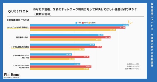 また、小学校、中学校、高等学校ごとに回答を分析した結果、それぞれの学校種別で異なる課題感が明らかになりました。しかしながら、「ネットワークの安定性向上」が共通して最も多く挙げられていました。