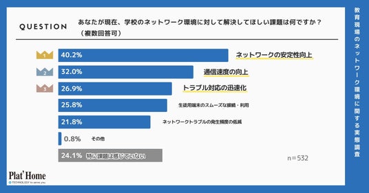 ぷらっとホーム株式会社(証券コード:東証スタンダード6836、本社:東京都千代田区、代表取締役社長:鈴木友康)は、全国の小学校、中学校、高等学校、特別支援学校に勤務する教員532名を対象に、学校のネットワーク環境に関するアンケート調査をインターネットで2025年1月21日に実施しましたので、その結果をお知らせいたします。