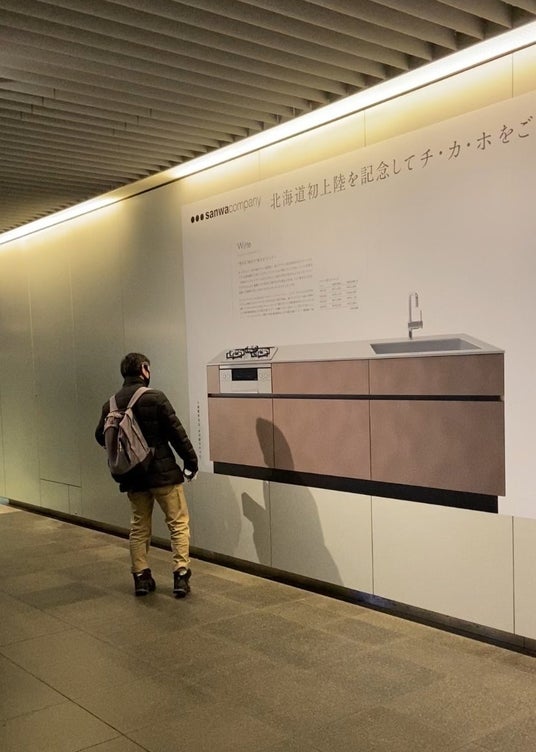 今回の広告は、札幌駅直結の当社札幌スマートショールームへの誘導を目的として企画・制作したもので、通行量の多い地下広場の特性を活かし、「見て、感じる」体験型のデザインを採用しました。最大の特徴は、キッチンや洗面台などの住宅設備機器を“実寸大”でビジュアル展開した点です。実物と同じスケールで印刷することで、広告を見た歩行者に、実際のサイズ感や生活導線をイメージしていただける工夫を施しました。