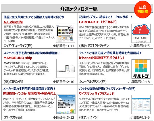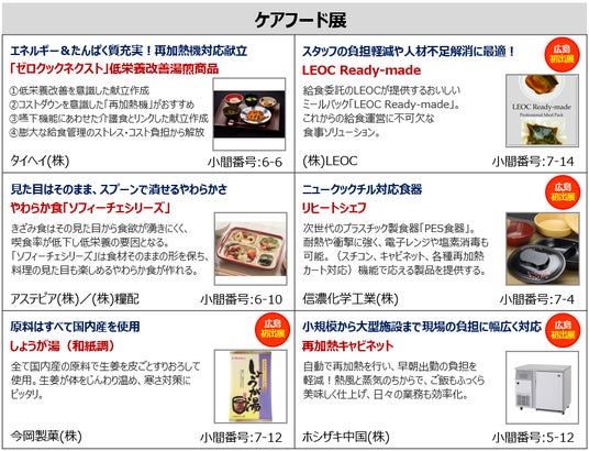 本展では、高齢者向け配食・食事関連サービスの専門展「ケアフード展」と介護事業者向けのシステム・見守り・ロボットの専門展「介護テクノロジー展」を同時開催する。さらに、介護テクノロジー展内に特別展示ゾーン「介護施設ソリューション ゾーン」を新設。前回の約4倍の規模に拡大し、介護事業者の課題解決や業界の情報収集を支援する。