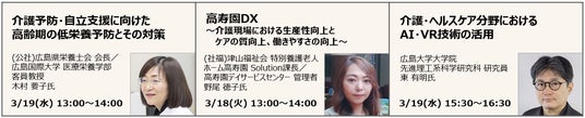 本展では、業界の第一線で活躍する専門家を講師に迎えた「専門セミナー」を同時開催する。介護の食コースでは、広島県栄養士会 会長 木村要子氏が高齢期の低栄養予防について解説。また、介護のテクノロジーコースでは、広島大学大学院 東有明氏が介護分野でのAI・VR技術の活用をテーマに講演。その他、誤嚥予防のための食事時のポジショニング、介護DXで生産性向上を実現した施設の取組み事例など、様々なセミナーをラインナップ。受講に必要な事前申込(無料)は、公式サイトにて受付中。定員間近のセッションもあるため、早めの受講申込をおすすめする。