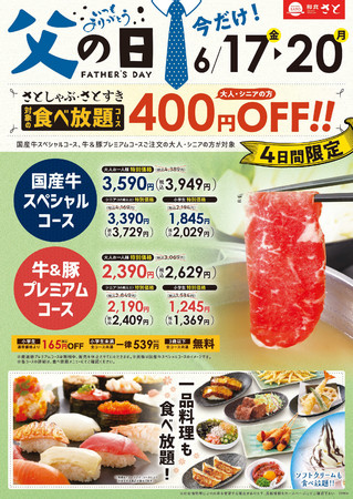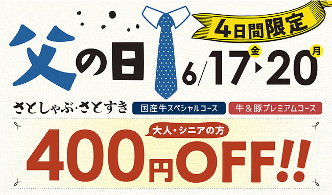 国内208店舗を展開する「和食さと」では、 6月19日(日)の父の日に合わせて、しゃぶしゃぶ/すき焼き食べ放題がとってもお得にご利用頂ける「父の日キャンペーン」を開催します。