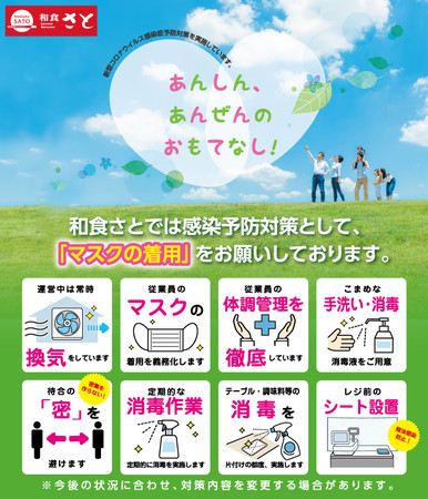 和食さとでは新型コロナウィルス感染症予防対策として、ご来店されるお客様へ「マスクの着用」のご協力をお願いしています。