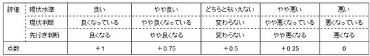 - 調査客体から収集した判断内容を下表のとおり点数化し、その平均値を最低0点から最大100点となる指数(Diffusion Index、DI)として示しています。そのため、この指数では50より大きいほど「購買意欲が強い」、小さいほど「購買意欲が弱い」と判断されていることになります。
