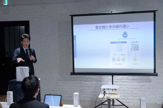 続いて、経営企画部係長 広報担当 浅尾より昨年12月1日に発売された電解水素水整水器「TRIM ION Refine White」について紹介しました。