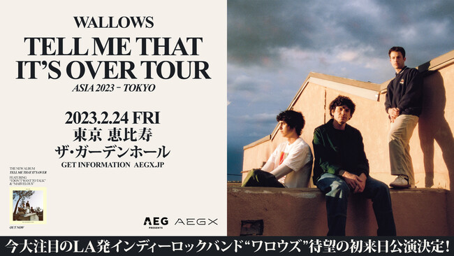 AEGXは、米LAを拠点に活動する3ピースバンド“ワロウズ”の東京公演「WALLOWS TELL ME THAT IT'S OVER ASIA TOUR 2023 TOKYO」を2023年2月24日(金)東京・恵比寿ザ・ガーデンホールで開催することを発表しました。チケットは11月8日(火)昼12時より最速先行受付(抽選)が開始されます。