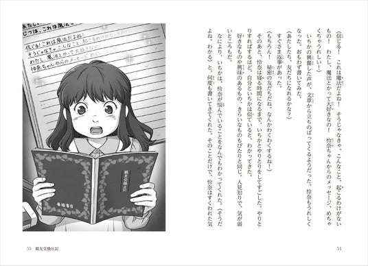 例えば、友達をつくりたい主人公・怜奈は、銭天堂で「フレンドブレンド」を手に入れますが、善福書店、善二の、「フレンドブレンドには副作用がある」「たくさんの友達がいるより、たったひとりの裏切らない親友をもったほうがいい」という言葉におされ、「親友交換日記」をもらいます。怜奈が日記になにかを書き込むと、誰にも渡していない日記から返事があり、日記の中に親友ができます。