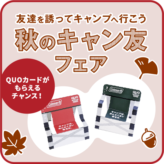 コールマン製品(ライセンス、並行輸入品、中古品は除く)30,000円以上(税込)のお買い上げで、ガソリンや食材購入に使えるオリジナルQUOカードを合計1,500名様にプレゼント!QUOカードは、使用後コールマンチェアになる遊び心溢れるデザインとなっています。さらに抽選で10組様には全国の提携キャンプ場「コールマンパートナーフィールド」11カ所から選べる無料ご招待券(2サイト分)もプレゼントします。
