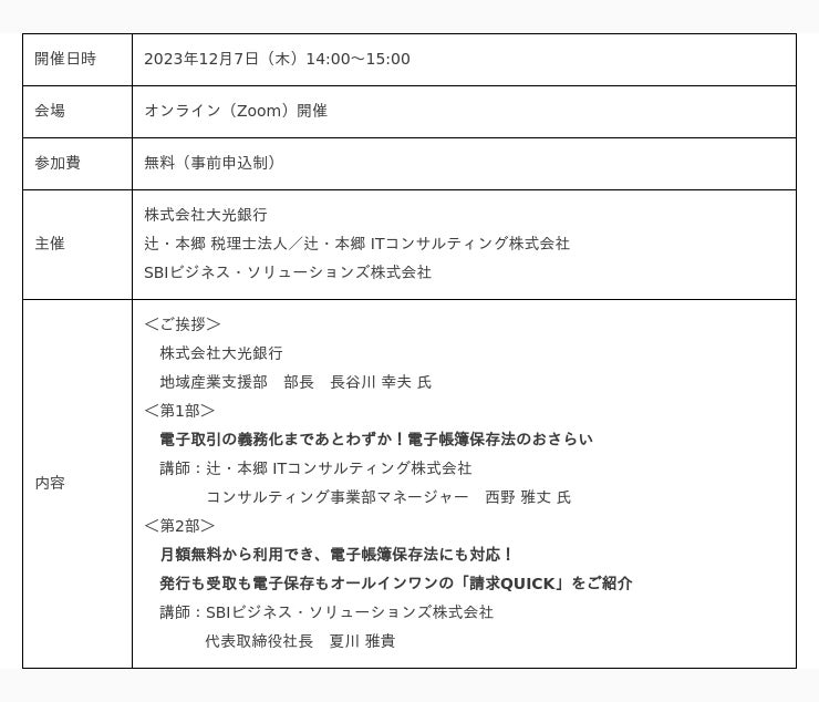 総合フィンテックソリューション企業であるSBI FinTech Solutions株式会社の子会社で、バックオフィス支援サービスを提供するSBIビジネス・ソリューションズ株式会社(本社:東京都港区、代表取締役社長:夏川 雅貴、以下「当社」)は、辻・本郷 税理士法人(本社:東京都新宿区、理事長:徳田 孝司)および、辻・本郷 ITコンサルティング株式会社(本社:東京都渋谷区、代表取締役:黒仁田 健、以下「辻・本郷グループ」)とともに、株式会社大光銀行(本店:新潟県長岡市、取締役頭取:石田 幸雄、以下「大光銀行」)のお取引先様向けに開催される、「電子帳簿保存法対応セミナー」に登壇しますので、お知らせいたします。