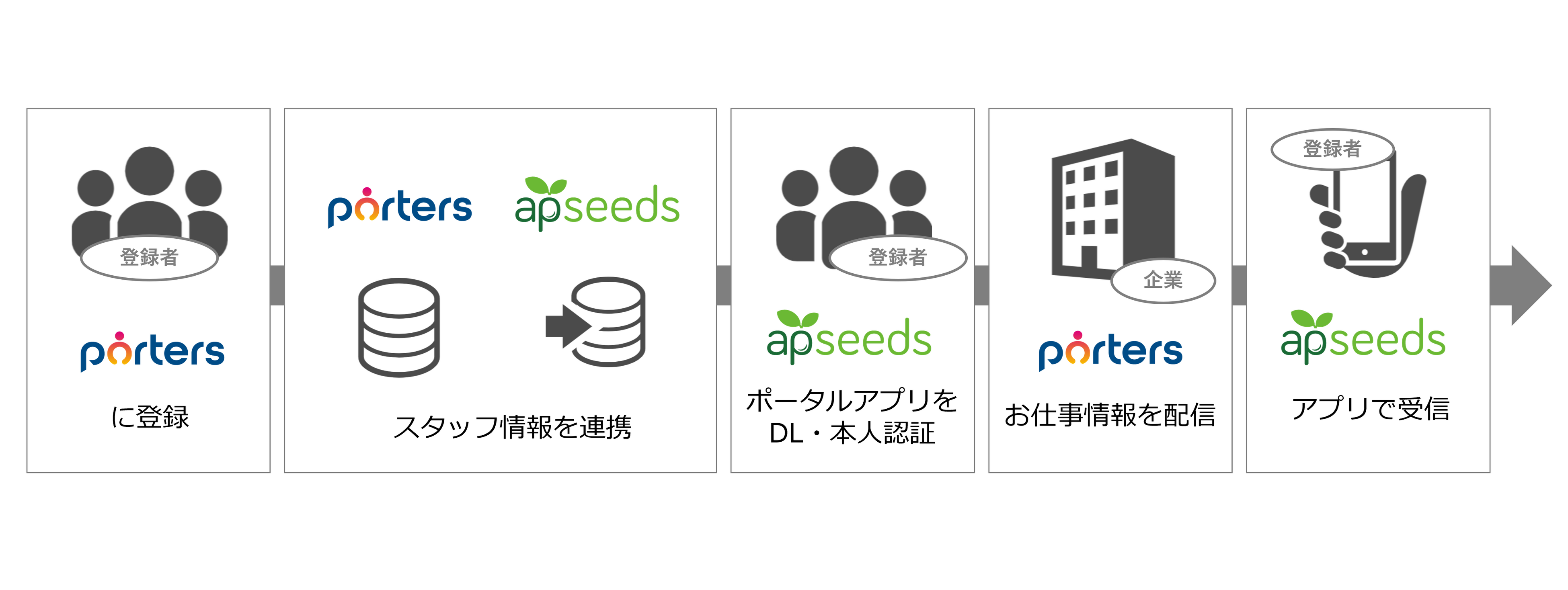 ポーターズ株式会社(本社:東京都港区、代表取締役社長:西森 康二、以下 ポーターズ)と株式会社エーピーシーズ(本社:東京都中央区、代表取締役 社長執行役員:藤本 勝典、マイナビグループ、以下 エーピーシーズ)は、人材派遣特化型マッチングシステム「PORTERS Staffing(ポーターズ スタッフィング)」と派遣スタッフ向けのスマートフォン業務用アプリ「apseedsポータル(エーピーシーズポータル)」のシステム連携開発を開始いたします。