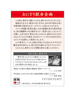 一社)日本鉄道構内営業中央会(東京都千代田区、会長:野並直文)は、2022年4月10日(日)の駅弁の日にあわせ、21社の会員駅弁業者とのコラボ企画として、それぞれがオリジナルで開発した「おにぎり駅弁」をそれぞれが販売いたします。これは、新型コロナウイルスの影響で旅客が減り、大きな影響を受けた21社の会員駅弁業者が、旅の醍醐味である駅弁をもう一度思い出してもらうことを願い、4月10日の「駅弁の日」にあわせ、駅弁のはじまりにちなんだ「おにぎり駅弁」を販売するという企画です。今回の企画に、横浜エフエム放送株式会社(横浜市西区、代表取締役社長:兒玉智彦)の番組「FUTURESCAPE」が、地元横浜の駅弁業者である「崎陽軒」とタッグを組んでオリジナル駅弁を販売することとなりました。また、今回のコラボ企画の柱として、それぞれがオリジナルで開発した「おにぎり駅弁」には、旅の気分を盛り上げるアイテムとして、21社の会員駅弁業者それぞれがおすすめする観光名所を紹介した駅弁カードが添えられています。