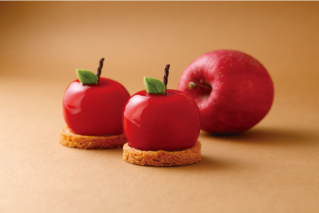 ショコラとリンゴのムースに真っ赤なグラサージュをかけた可愛いケーキ。