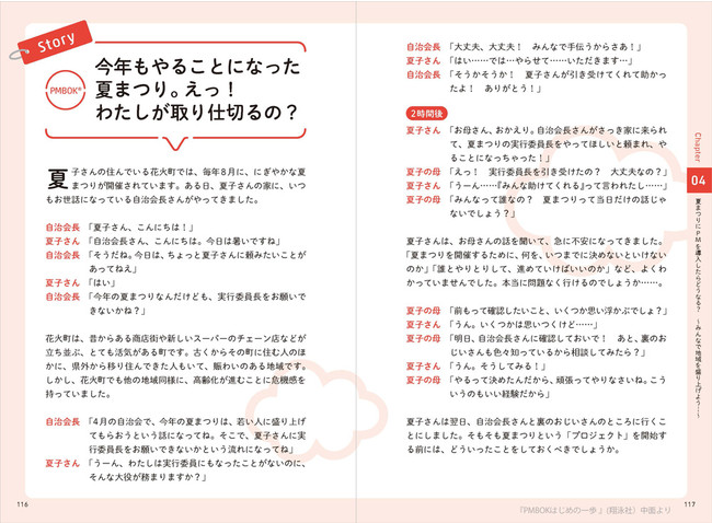 例えば、「テーマパーク企画にPMを導入したらどうなる?」「夏まつりにPMを導入したらどうなる?」などユニークなケーススタディで、PM導入のメリットについて学ぶことができます。