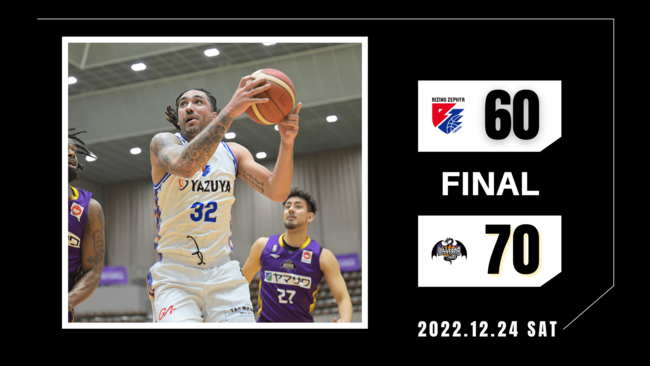 2022年12月24日(土)に開催されましたBリーグ第13節【ライジングゼファーフクオカvs.山形ワイヴァンズ】において“福岡60-70山形”の結果となりましたことお知らせいたします。
