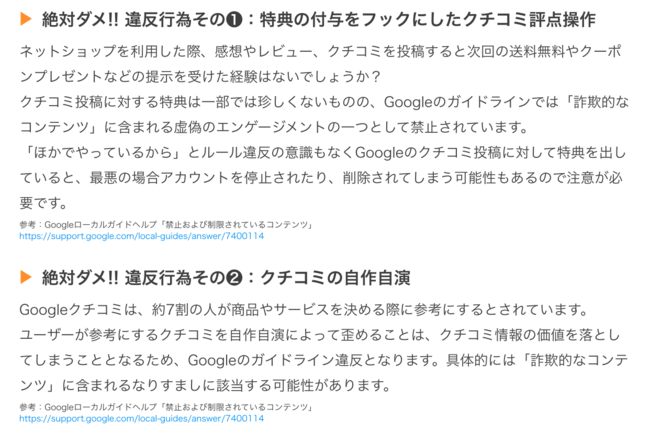 ・特典の付与や自作自演など、ガイドラインで禁止されているクチコミの収集方法