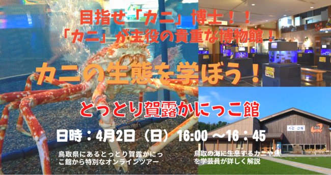 今回とっとり賀露かにっこ館からお届けする、鳥取県のカニや水生生物の生態を学ぶことができるスペシャルオンラインツアーです。