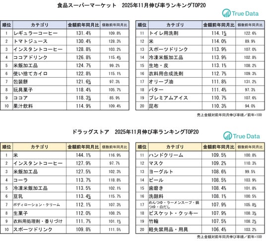 ビッグデータプラットフォームを運営する株式会社True Data(トゥルーデータ/本社:東京都港区、代表取締役社長:米倉 裕之、証券コード4416)は、当社の統計データをもとに、ドラッグストア、食品スーパーマーケットにおける2025年11月の売り上げ伸長カテゴリを発表します。