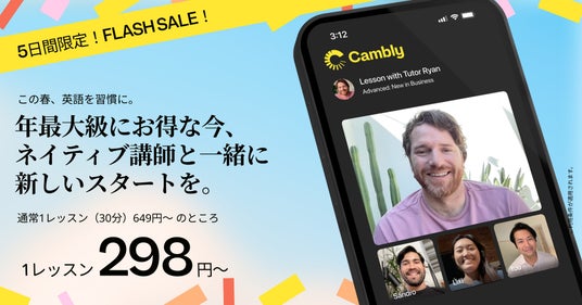 Cambly Inc.(本社:アメリカ・サンフランシスコ | 日本マーケティング担当:小川 葉子)は、2025年4月7日(月)~4月11日(金)の5日間限定で「春のFLASH SALE」を開催します。英語学習を始めたいけど、なかなかきっかけがなかった方や、新年度を迎えて学習習慣を作りたいと考えていた方にぴったりのこの機会。通常30分あたり649円の英会話レッスンが、今回のセール期間中はなんと1レッスン298円~でご利用いただけます。年最大級にお得なこのチャンスを活用して、新しい季節とともに英語学習を始めてみませんか?