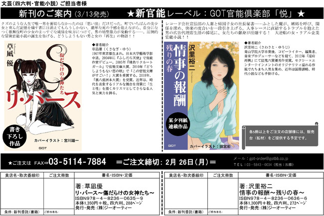 第1弾は、著:草凪優『リ・バース~傷だらけの女神たち~』と著:沢里裕二『情事の報酬~残りの春~』の2作品を3月13日に発売する予定です。