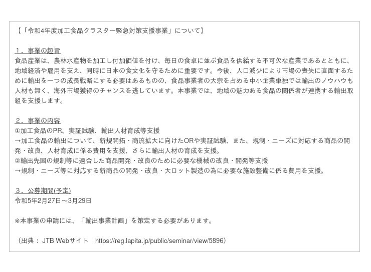今後SoLaboでは、「令和4年度加工食品クラスター緊急対策支援事業」を活用し、海外展開を実現したいという強い想いを持つ食品製造・加工事業者を対象に、外部プログラムを担うアリババとの連携のもと、当補助金の相談・申請支援サービスを提供開始いたします。