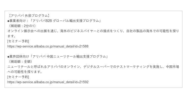 また現在公募期限が迫る中、連携先のアリババでは、当補助金対象の外部プログラムとして、「事業者」「業界団体」を対象に展開する2つのサービスについて、説明セミナーを開催しています。ご興味をお持ちの方は以下より、詳細をご確認下さい
