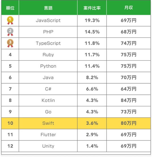 Swiftの案件市場は限定的ながらも重要なポジションを占めており、全プログラミング言語案件中3.6%の比率で案件数ランキング10位に位置しています。この数字はモバイルアプリ開発市場の専門性を反映しており、比率は低めながらも高度な専門性を持つ開発者にとって価値ある市場を形成しています。Apple製品のエコシステム依存という特性上、案件数は他の汎用言語に比べて少ないものの、質の高いSwift開発者への継続的な需要が期待できます。