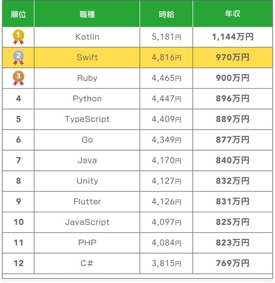 平均年収970万円(言語年収ランキング2位)