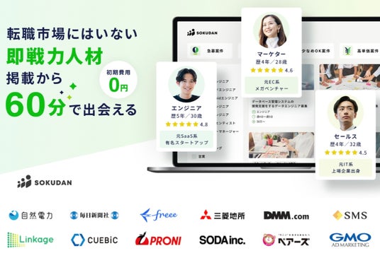 転職マーケットにいない即戦力人材を最短1日で見つけることができる、最速の複業マッチングプラットフォームです。20代後半~40代前半のIT領域に強いエンジニア、マーケター、セールス、BizDev、UI・UXデザイナーの5職種を中心に、最近ではコーポレート人材なども増えております。