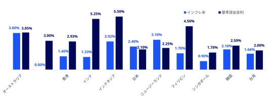 出典:Oxford Economics|実質GDP成長率(前年比)。インフレ率は2025年12月時点で各国の公式統計機関から入手可能な最新データに基づく。基準貸出金利は各国中央銀行が決定する最新の政策金利を示す