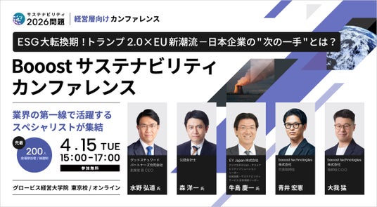 統合型SXプラットフォーム「サステナビリティERP(※1)」の提供と「サステナビリティ2026問題」の提唱により企業のサステナビリティ・トランスフォーメーション(SX)(※2)の加速を支援するbooost technologies株式会社(東京都品川区、代表取締役:青井宏憲 以下 当社)は、2025年4月15日(火)に「Booost サステナビリティカンファレンス」を開催します。本イベントでは、最新のESG政策や規制動向の解説や、日本企業が今取るべき戦略を明確化し、持続可能な成長と競争力強化に向けた実践的な洞察を提供いたします。