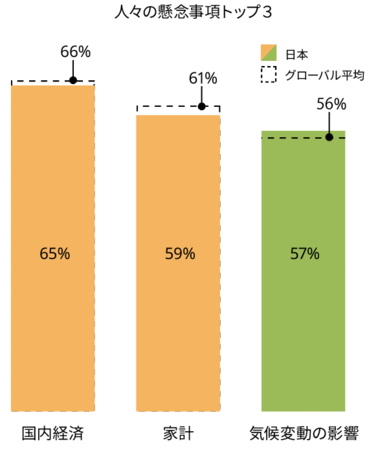 世界37カ国、37,000人以上を対象にしたこの調査では、世界の61%が家計に不安を感じており、世界的にインフレが進む中66%が国内経済について不安を感じていることが明らかになりました。また、経済に対する不安は、気候変動の影響に対する不安(56%)を上回り、世界の人々の間で最も関心が高いことがわかりました。 日本でもほぼ同等で、65%が経済、59%が家計、57%が気候変動を不安に感じています。また懐が寒くなることで、世界の43%、日本では33%が旅行や外食といった家の外での趣味が影響を受けると予想しています。