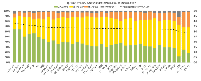 「昨年と比べて自分の家についてよりポジティブに感じている」と回答した日本人は12%のみで、調査対象37ヵ国中35位と低い結果に