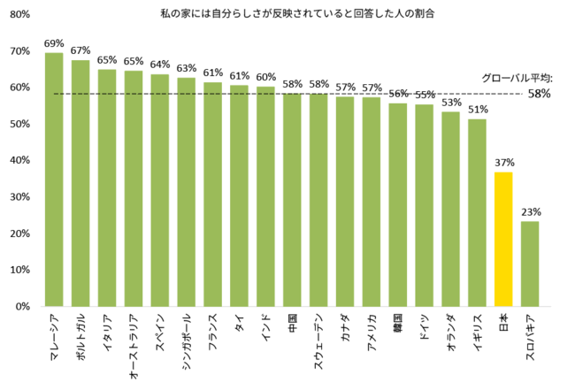 家が自分らしさを表現していると感じている日本人は37%、世界平均は58%