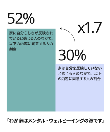 今回の調査で特徴的だった結果のひとつは、世界の37%が、「自分の家について昨年と比較しよりポジティブに感じている」と回答した一方で、日本では12%と低い割合で、37ヵ国中35位であったことです。レポートでは家に自分らしさが反映されているとき、家がメンタル・ウェルビーイング(精神的に満たされた状態)の源だと考える傾向が1.7倍であることも明らかになりました。