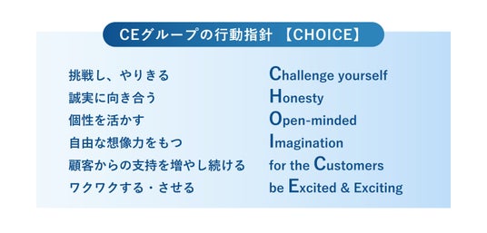 CEグループでは、ミッションである「心動かすエンタテインメントで、明日(あす)を拓(ひら)く」を体現するために必要な行動指針を“CHOICE”として定義しています。 この“CHOICE”に則った行動を査定に繋げることで、企業理念のさらなる浸透と醸成を図ります。
