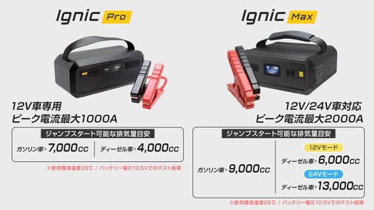 スイッチ一つで簡単に12V/24V出力を切り替え可能、ロードサービスなどのプロが使うものと遜色ない性能を持つIgnic Max(イグニック マックス)の2モデルをご用意。