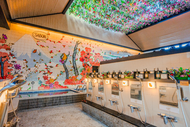 湯舟につかりながら、異空間へのトリップをご体験いただけます。また、堀田湯の象徴である「葛飾北斎の桜花と富士のタイル絵」にSABONのグラフィックを融合させ、まるでアート作品のように仕上げました。