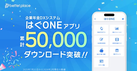 「福祉はぐくみ企業年金基金」(以下、「はぐくみ企業年金」)を中心に、企業年金・退職金制度の導入・設計をサポートする株式会社ベター・プレイス(本社:東京都新宿区、代表取締役社長:森本 新士、https://bpcom.jp/ 、以下、ベター・プレイス)は、2025年7月31日にリリースした「はぐくみ企業年金」の導入法人・加入者に向けた企業年金DXシステム「はぐONE」のスマートフォンアプリが、約半年で累計5万ダウンロードを突破したことをお知らせします。