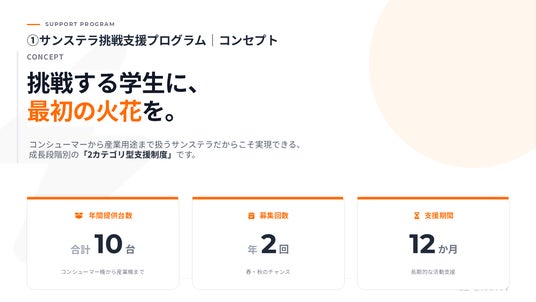 本プログラムは、「挑戦するすべての人に、最初の火花を。」をコンセプトに、コンシューマー用途から産業用途まで幅広い製品ラインナップを持つ当社だからこそ実現できる、成長段階別の支援制度です。