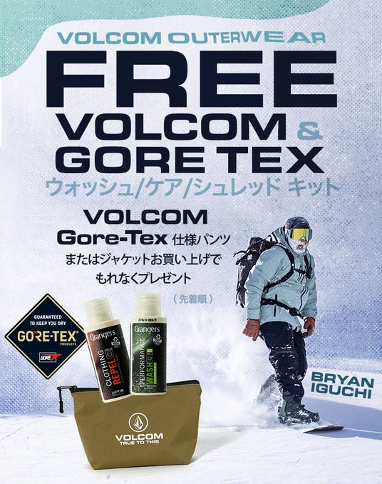 対象:期間中にVOLCOMスノーアウターウエアGORE-TEX製品のジャケットもしくはパンツをご購入されたお客様全員(賞品はなくなり次第終了)