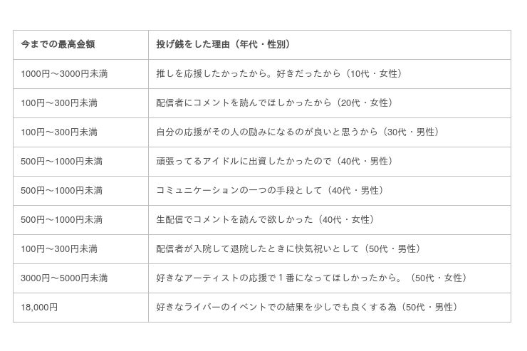 「好きなライバーのイベントでの結果を少しでも良くする為」という理由で18,000円もの金額を投げ銭したことがある方もいるように、自分が推している人のためなら惜しまず投げ銭したいと思う方も、一定数いるようです。