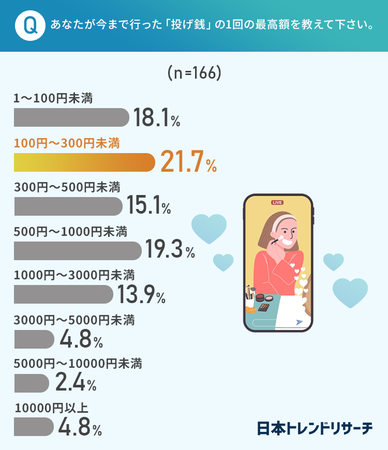 また、「投げ銭の1回の最高金額」についての質問では、「100円~300円未満」が21.7%と、もっとも多い結果になりました。
